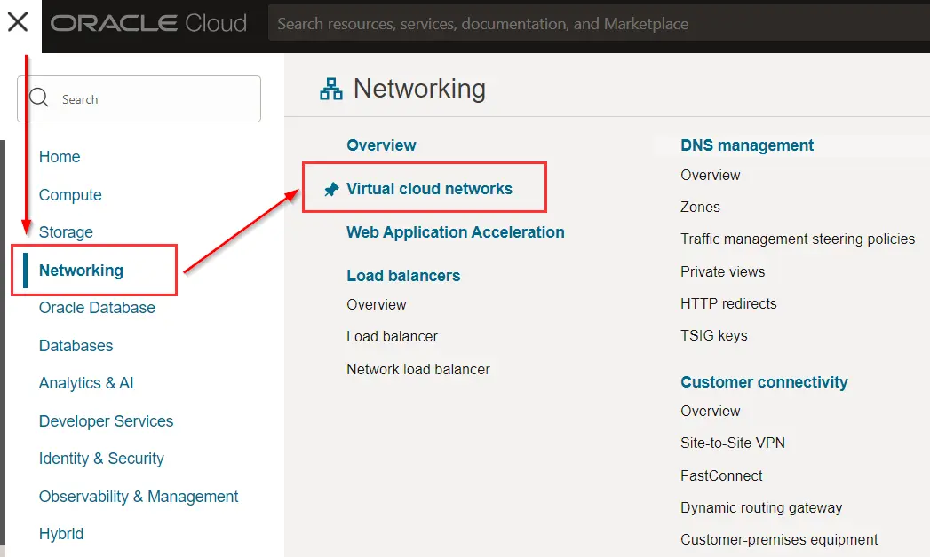 - Open the navigation Under Networking and click Virtual Cloud Networks.