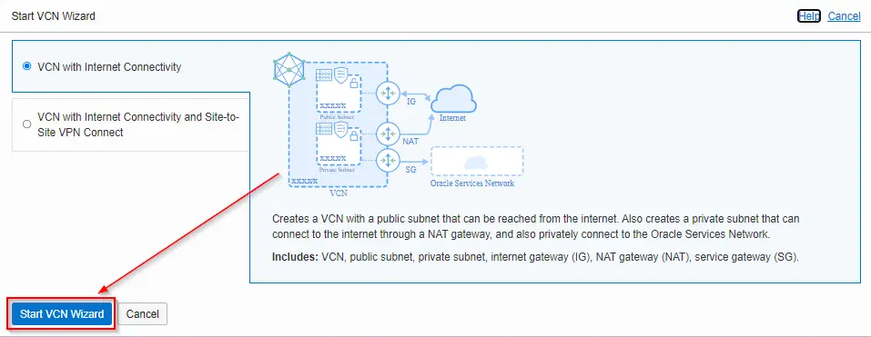 - Select VCN with Internet Connectivity option and Click Strart VCN Wizard