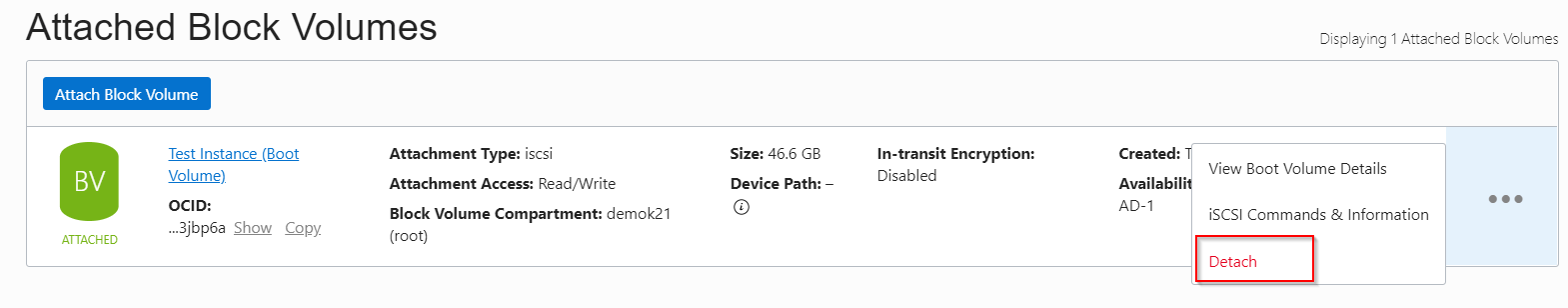 Step 2: Detach the boot volume. In the Boot Volume section, click the Actions icon and choose Detach.