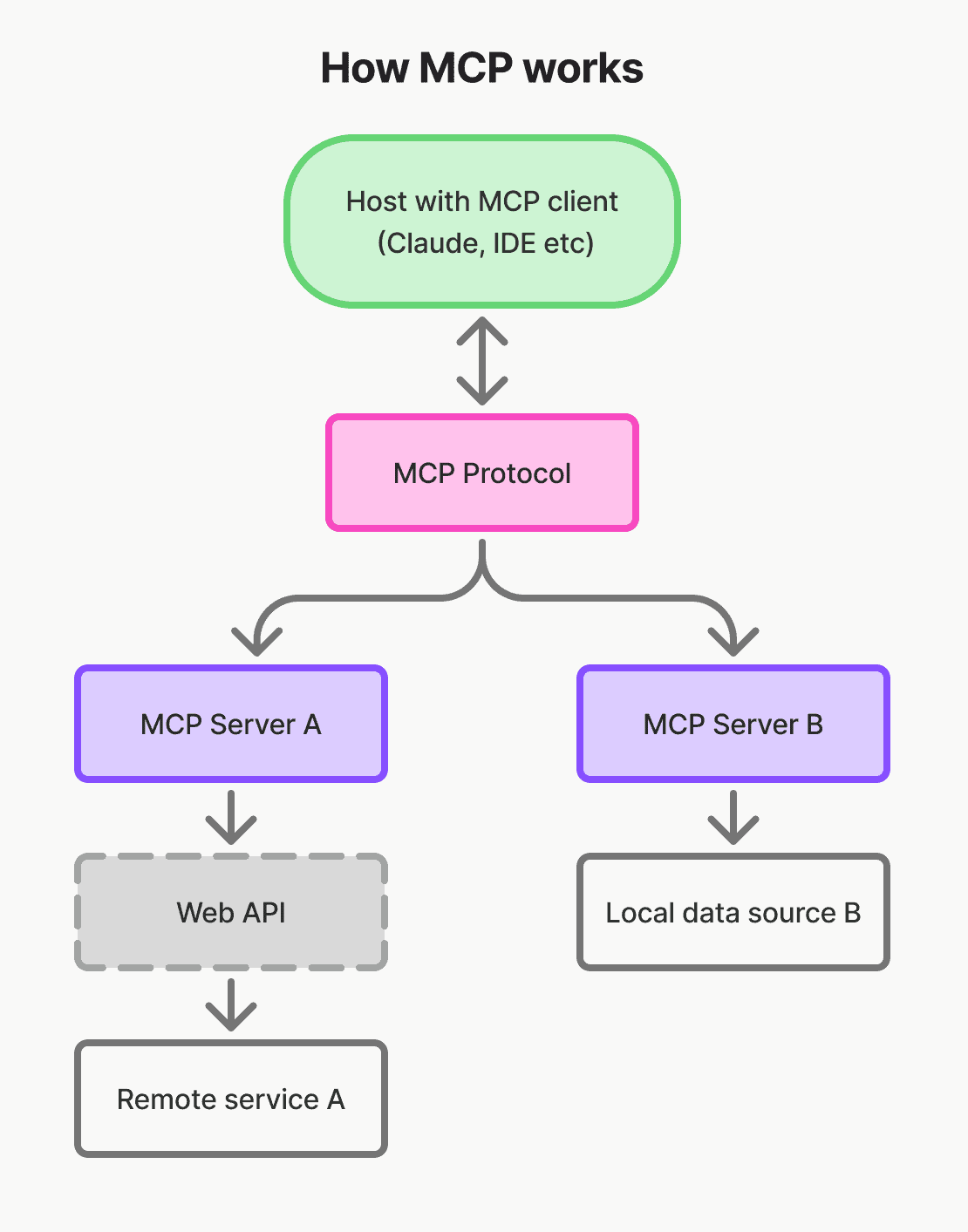 - MCP Servers: Lightweight servers exposing specific functionalities via MCP, connecting to local or remote data sources
