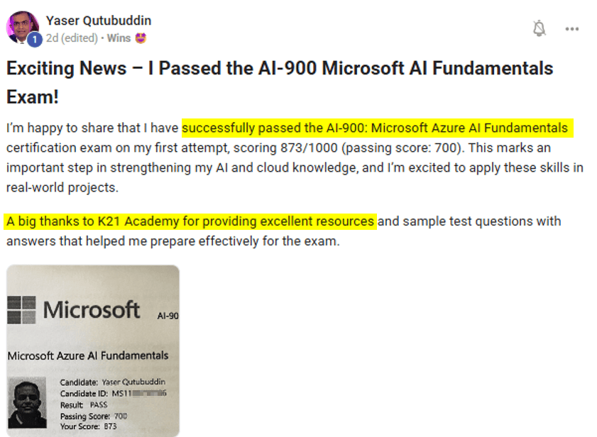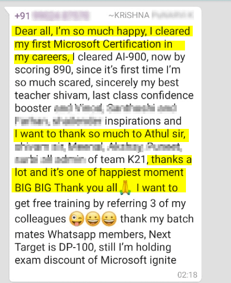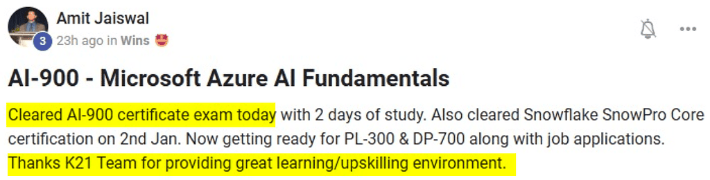 Completed AI-900 Certification successfully with scoring 914/1000. Next Targeting for AI-102 and DP-100 Certification. Job Application and Converting to Interview call still in progress.