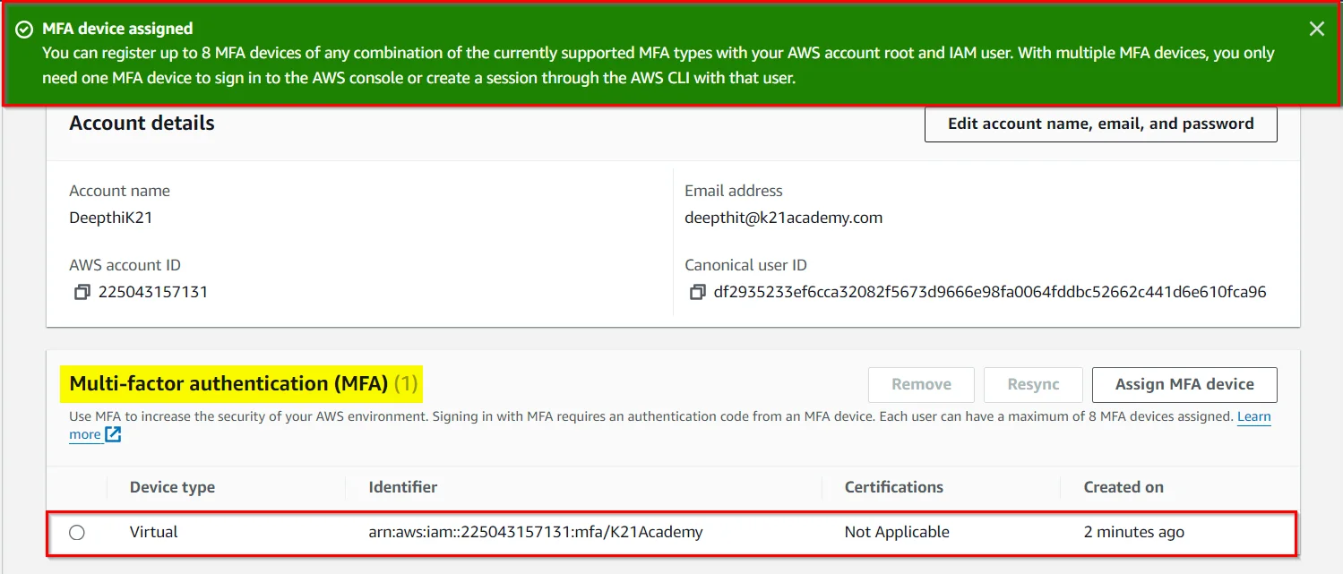 12) Now you have successfully Activated MFA on your root account setting