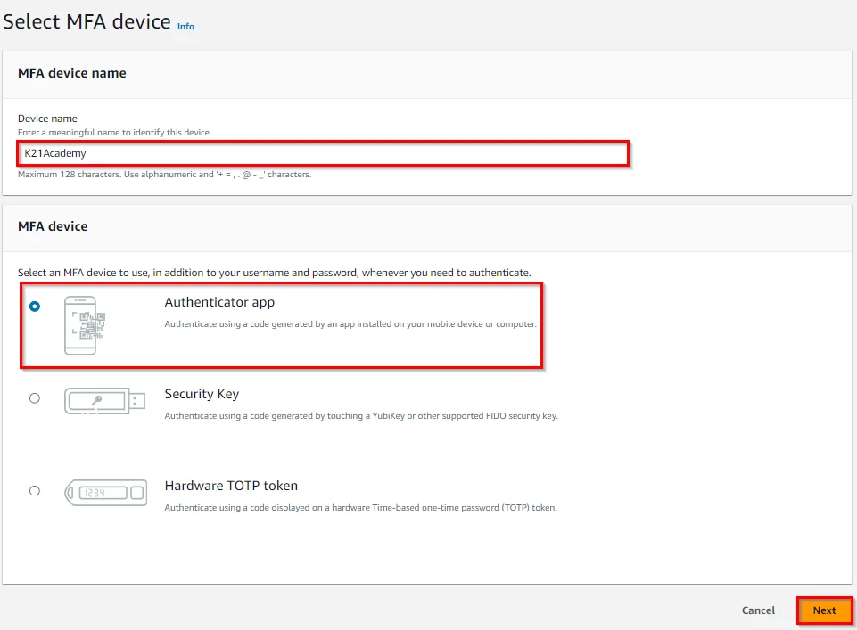 4) Provide MFA device name and then Select the MFA device as the Authenticator app. Click on Next.