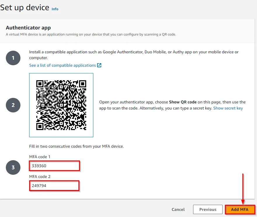 8) Now Click on Show QR Code in AWS Console and open the Google Authenticator app on your phone. Scan the code in phone and then Enter the code from your Phone into MFA code 1 and MFA code 2.