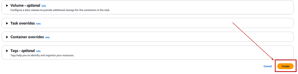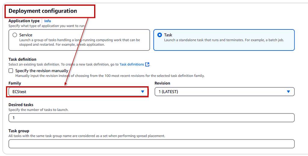 - Task Size: Specify the task’s memory and CPU requirements (e.g., 0.5 vCPU and 1GB RAM).