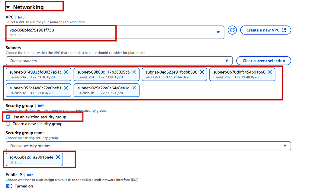 - Choose the correct subnets and security groups: