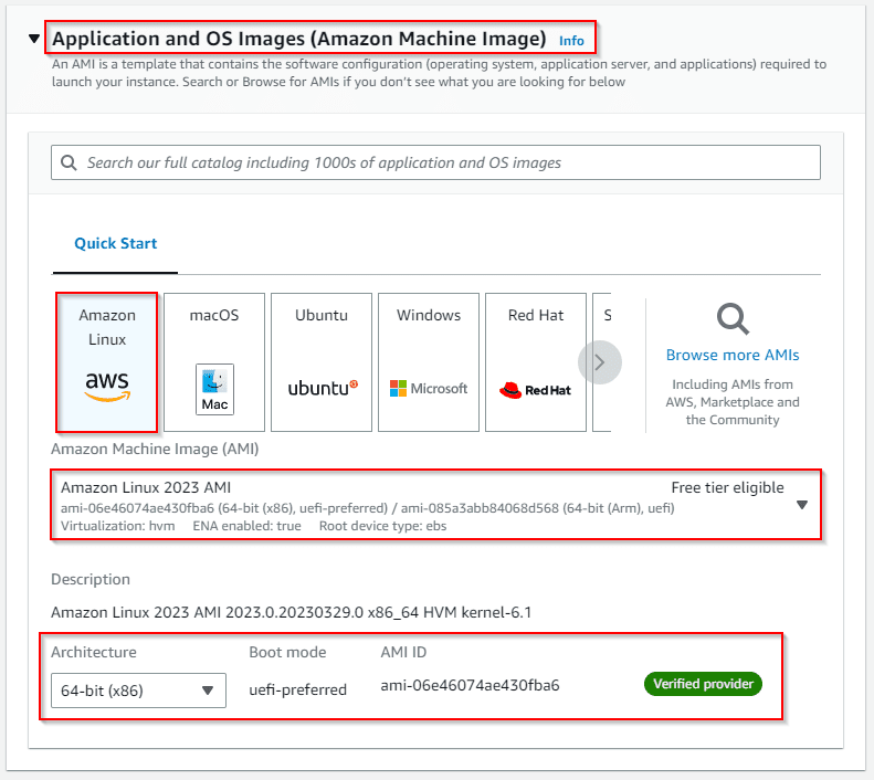4. Choose Amazon Linux 2023 AMI, select 64-bit (x86) architecture, and Scroll Down.
