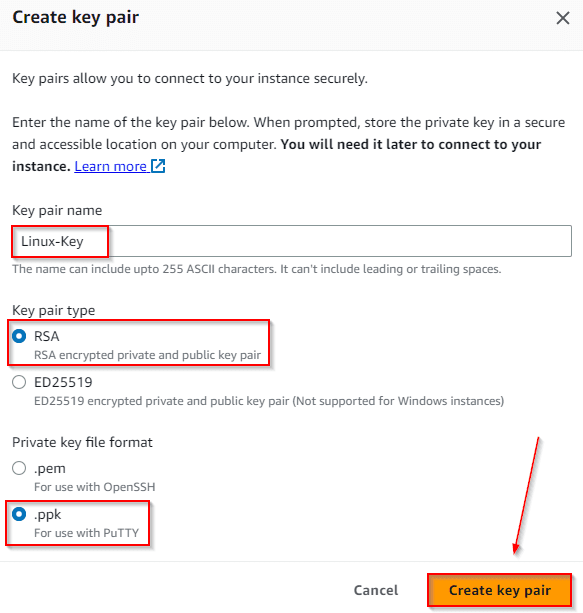 6. Select an existing key-pair or create a new one, we will create a new one, enter the name of the Key-pair as Linux-Key and rest everything Default.