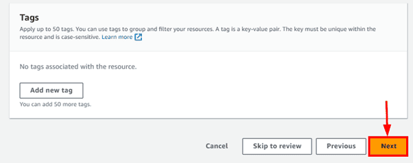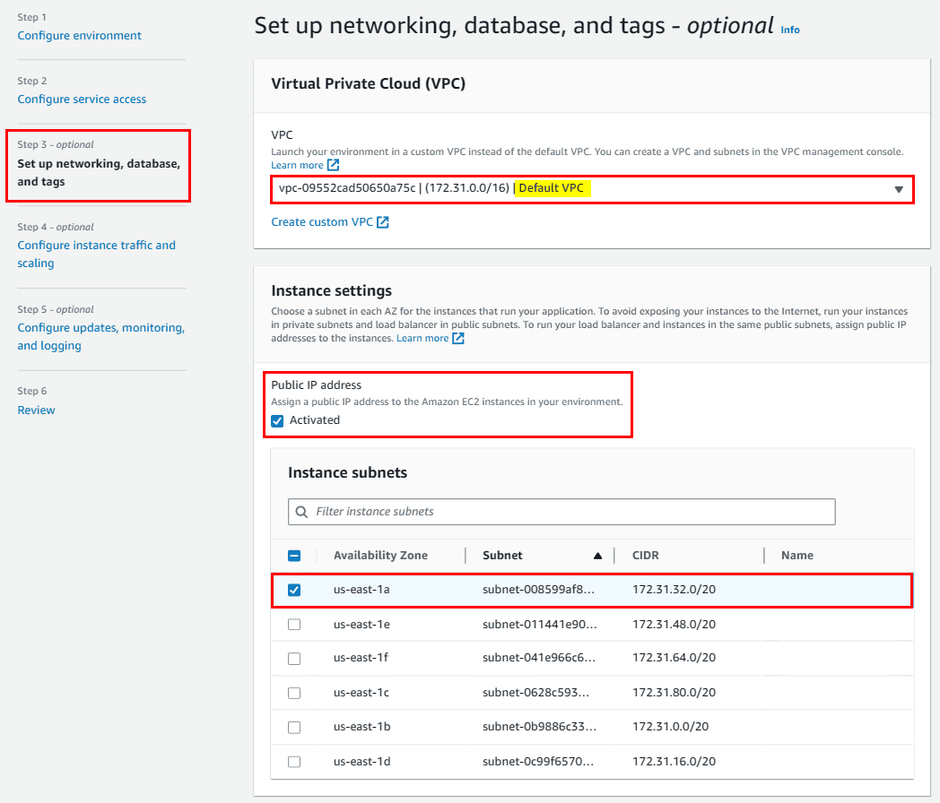 9. In the networking, database, and tags section, choose Default VPC, Enable public IP address, and select availability zone as us-east-1a.