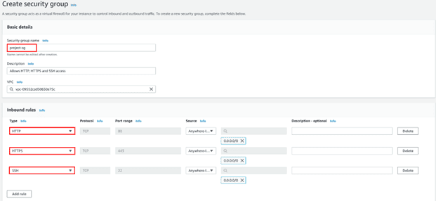 11. Create a security group by going to EC2 Dashboard > Security Groups > Create security group. Create a security group that allows HTTP, HTTPS, and SSH traffic from ANYWHERE.
