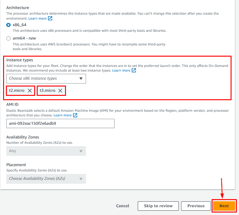 13. Now, scroll down and select t2.micro and t3.micro from the dropdown menu as desired instance types. Remove any existing instance types. This is to ensure we perform this project at minimum cost. Click on Next.
