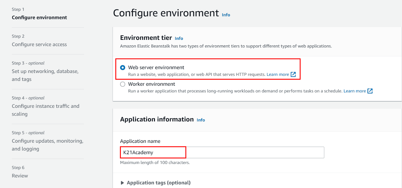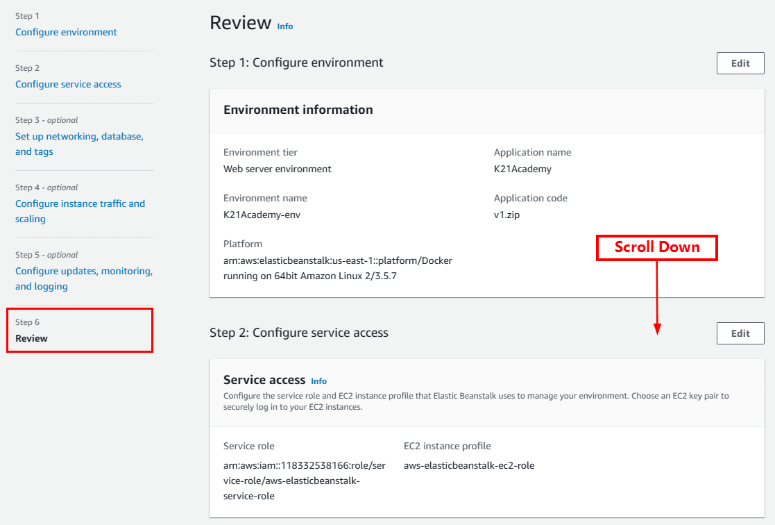 Note: We need to configure service access and create a role for Elastic Beanstalk so that it can assume this role when calling services on our behalf. This allows Elastic Beanstalk to automatically deploy new versions of our application