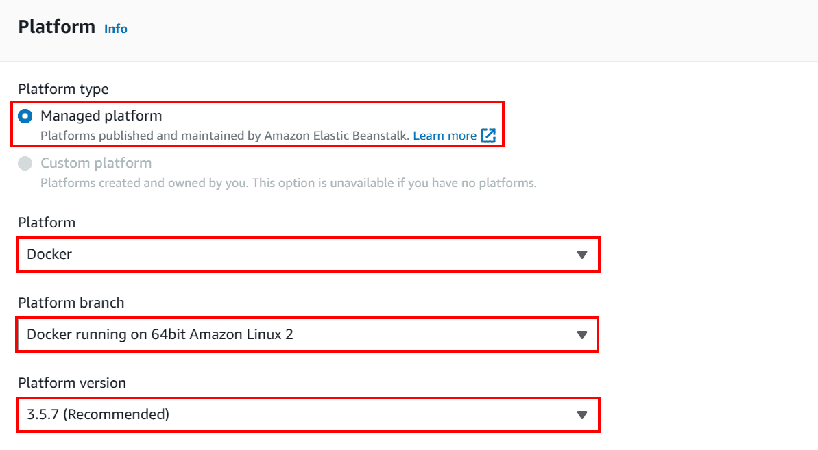 Platform Branch 🡪 Docker running on 64bit Amazon Linux