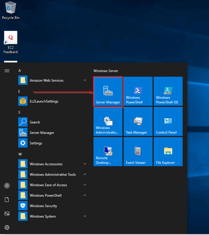 1: Once you connect with your Ec2 Instance, click on the Start button, and then click on Server Manager.