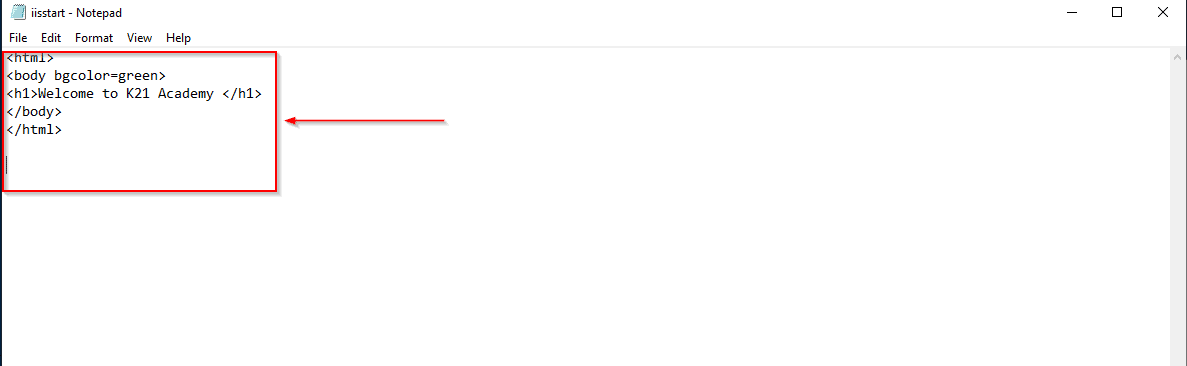 <html> <body bgcolor=green> <h1>Welcome to K21 Academy </h1> </body> </html>