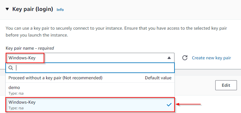 5: Select an existing key pair or create a new one; we will create a new one, enter the name of the Key-pair as Windows-Key, and Create the Key Pair.