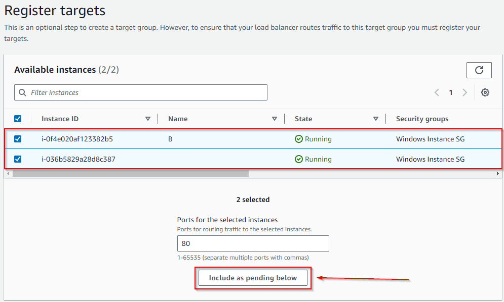 8: Under Register Target, select Instance A and Instance B, then click on Include as pending below, and then click on Create Target Group.