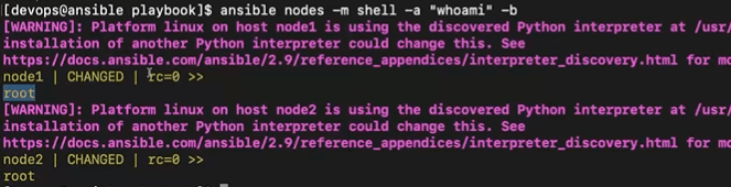 - ansible nodes -m shell -a “whoami” -b