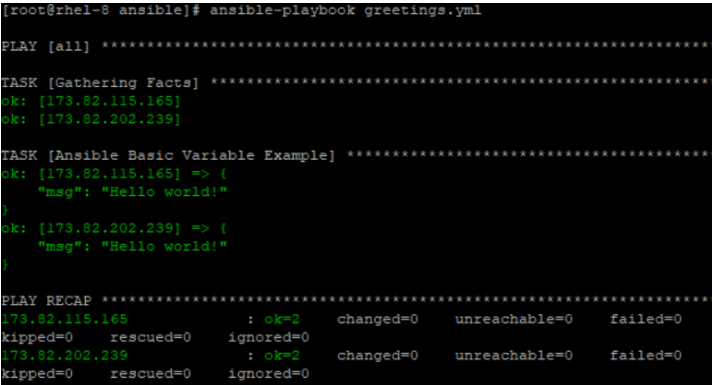 In the above playbook, the greeting variable is substituted by the value Hello world! when the playbook is run. The playbook simply prints the message Hello world! when executed.