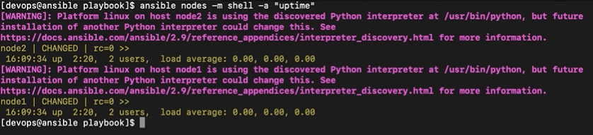 - ansible nodes -m shell -a “whoami”