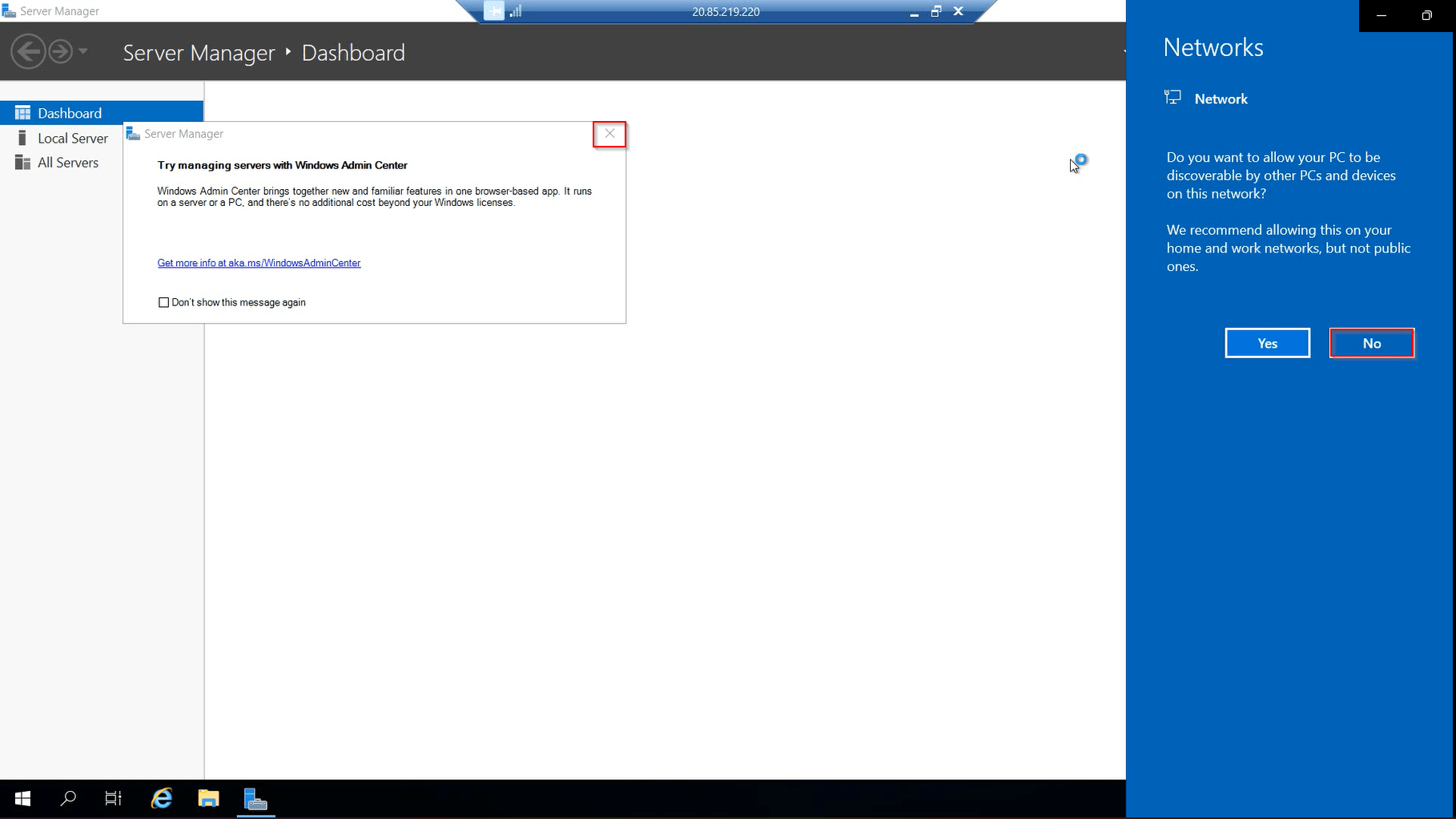 6.) A Remote Desktop window will open. On the right, select the No button to indicate you do not want the computer to be discoverable by other devices on the network. Close the small Server Manager popup dialog by clicking the X in the top right of the box. Keep the big Server Manager Window open.