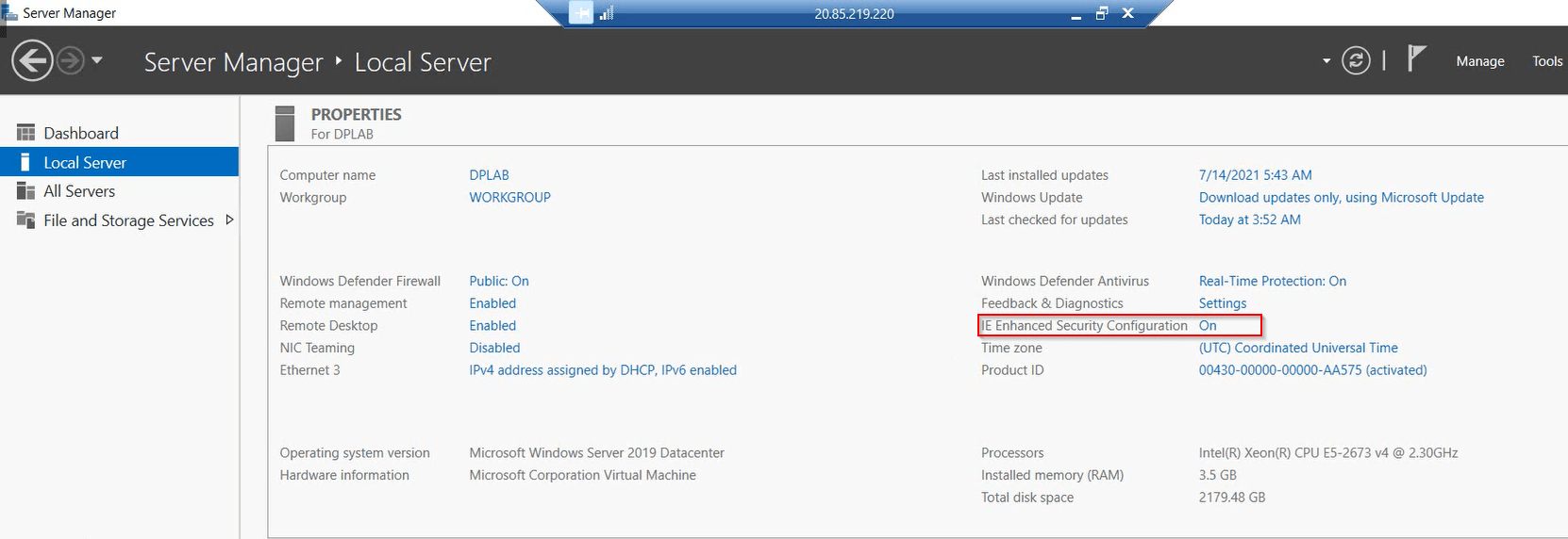 7.) In the Server Manager window, select the local server on the left and then select On next to IE Enhanced Security Configuration.
