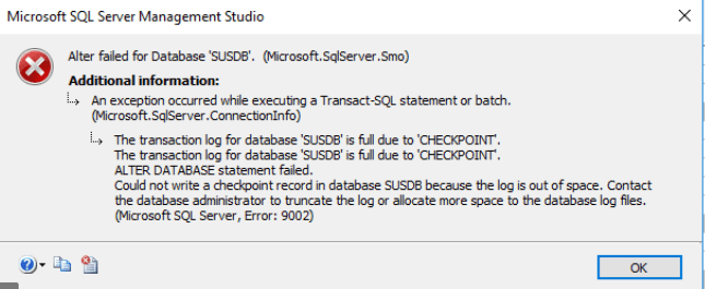 - You may see errors 9002 or 40552 when the transaction log is full and cannot accept new transactions. These errors occur when the database transaction log, managed by Azure SQL Database or Azure SQL Managed Instance, exceeds thresholds for space and cannot continue to accept transactions.