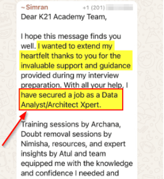 In February 2023, I began my first job as a USA immigrant in a shop with little hope for a better life. Discovering K21 Academy online and chatting with CEO Atul inspired me immensely. I enrolled the next month, overcoming work distractions with K21’s support. Despite initial exam registration doubts, the results proved K21 Academy’s effectiveness. Grateful to the CEO and instructors, I’m excited to transition to a better work life with the support of K21 Career Success team. Thanks to K21 Academy for restoring hope in my life!