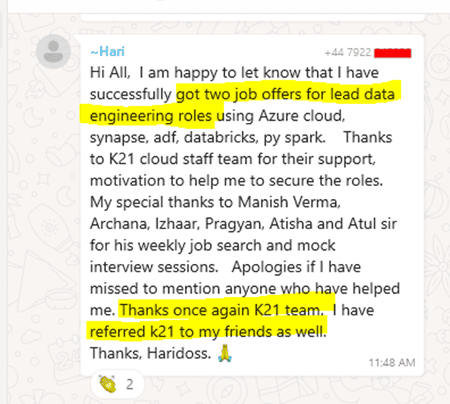 Completing the certification with K21Academy opened doors to multiple job offers. Discovering the institute on Google, I attended a compelling free class where Atul’s insights boosted my confidence. Enrolling in the program, the video and live lectures, along with comprehensive study materials, facilitated a clear understanding of cloud concepts. The abundance of practice questions and quizzes further enriched my learning experience.