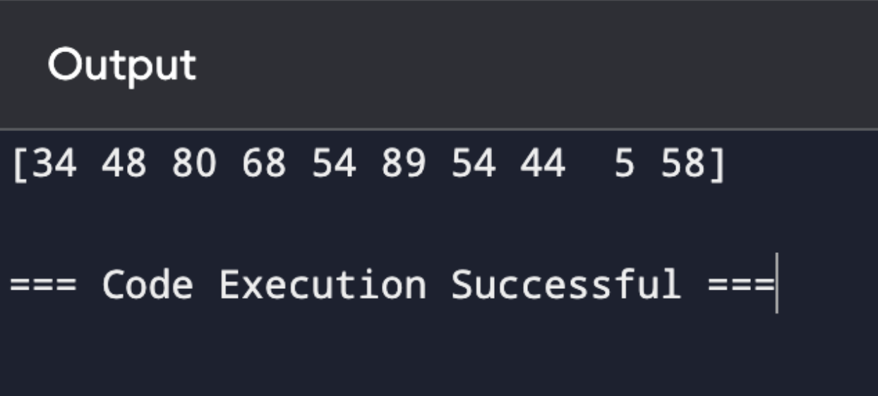 import numpy random_numbers = numpy random.randint(1,101,10) print(random_numbers)