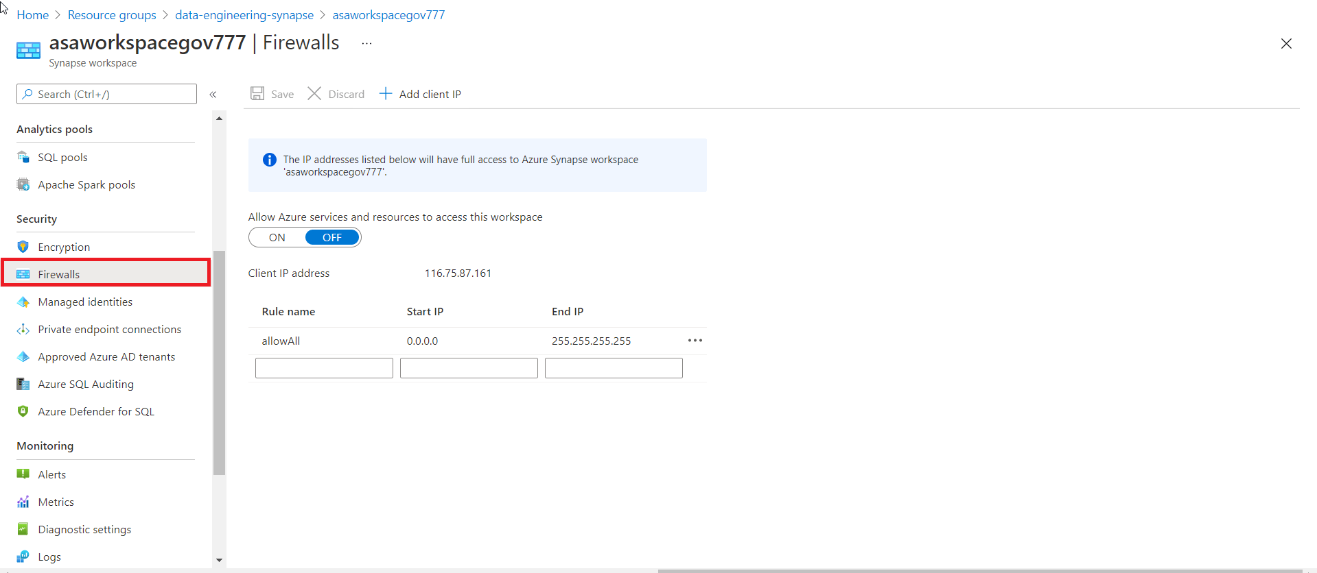 Firewall rules enable you to define the type of traffic that is allowed or denied access to an Azure Synapse workspace using the originating IP address of the client that is trying to access the Azure Synapse Workspace. IP firewall rules configured at the workspace level apply to all public endpoints of the workspace including dedicated SQL pools, serverless SQL pool, and the development endpoint.