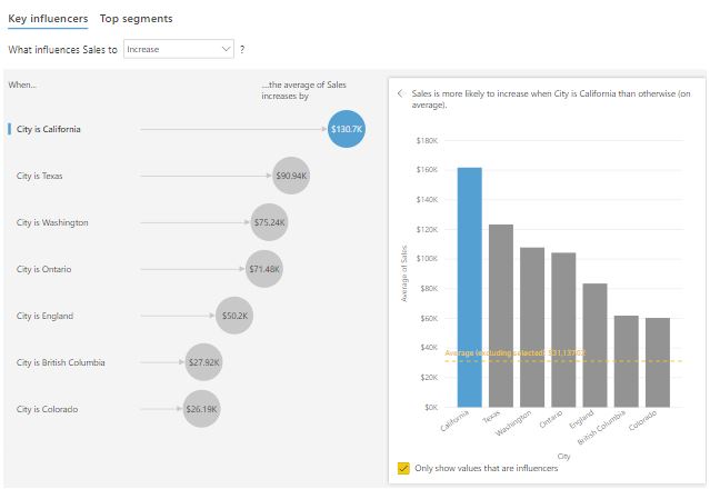 - The Key influencers visual helps you understand the factors that are affecting a specific metric. It analyzes your data, ranks the factors that matter, and then displays them as key influencers.