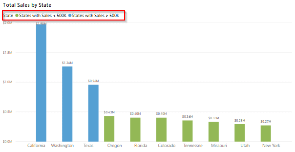 - The following image shows a bar chart in which PowerBI has automatically segmented the data in the way that it found most useful: Total Sales by State.