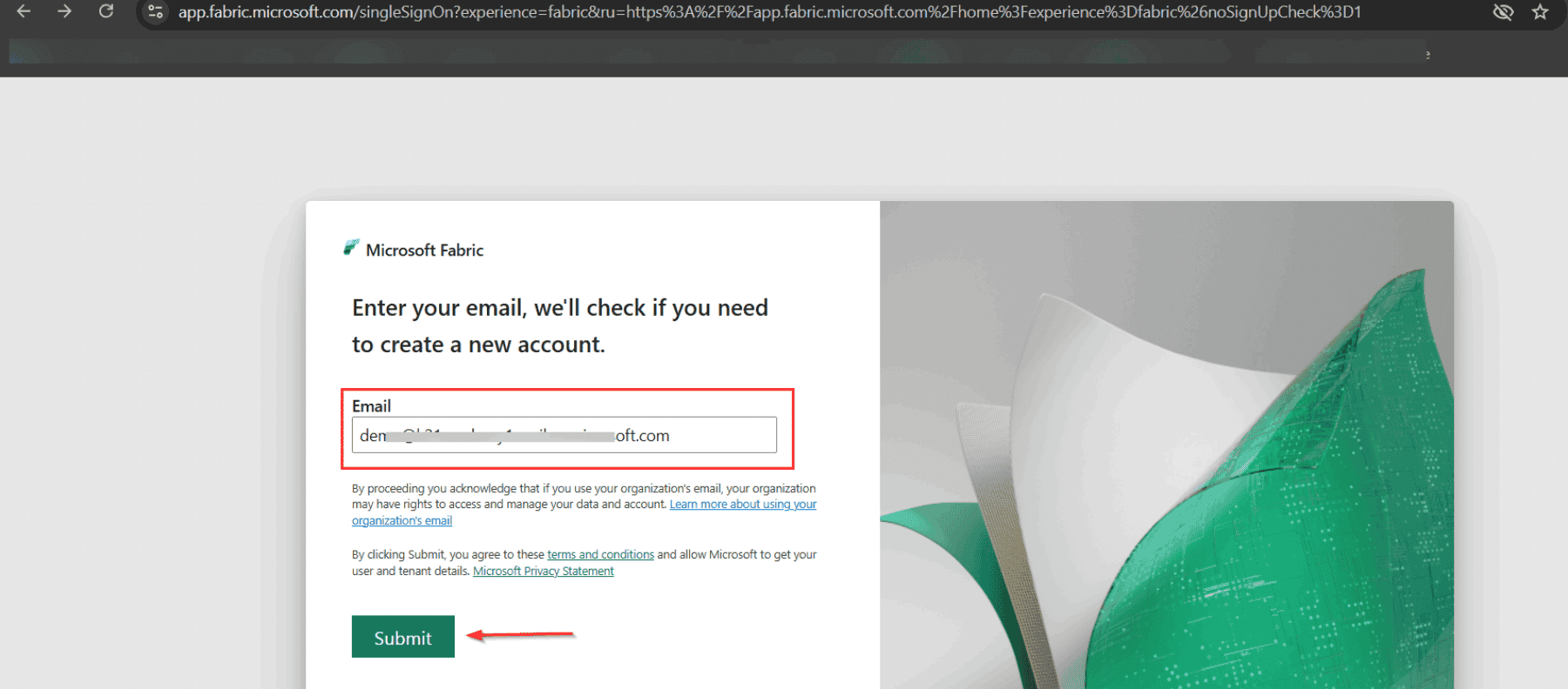 Step 2: In the new incognito browser, open https://app.fabric.microsoft.com and Put The Entra ID or password that you had copied onto a notepad during the creation process, Click on Submit.