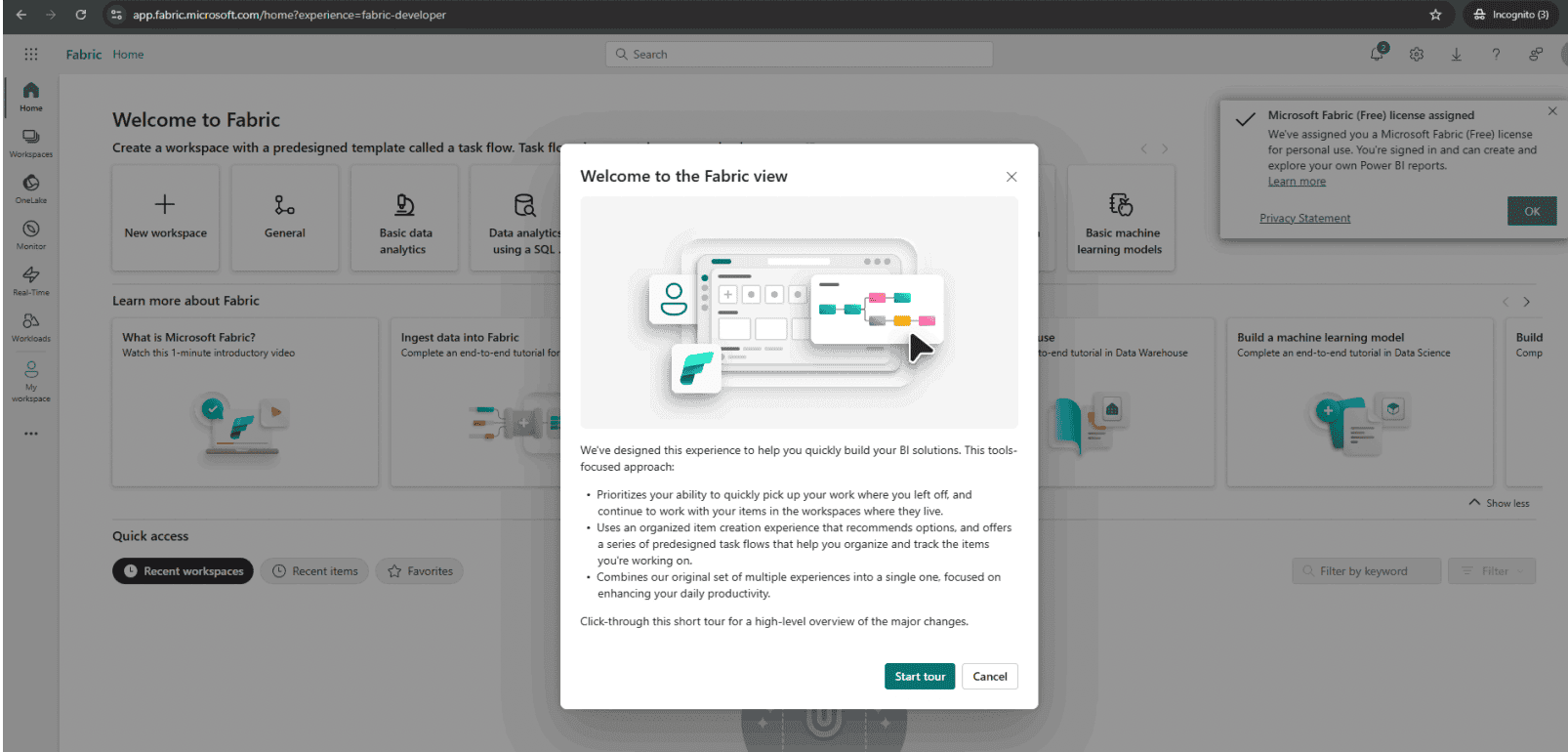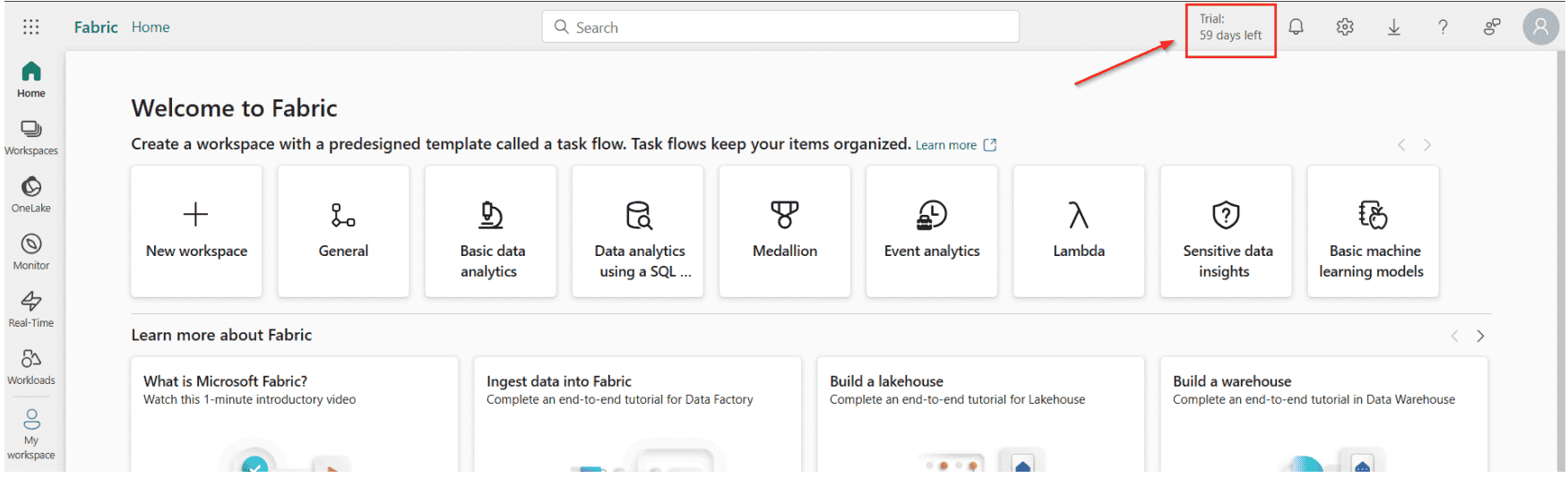 Step 14: You’ll see that your free trial has started. You can now explore the features and capabilities of Microsoft Fabric.