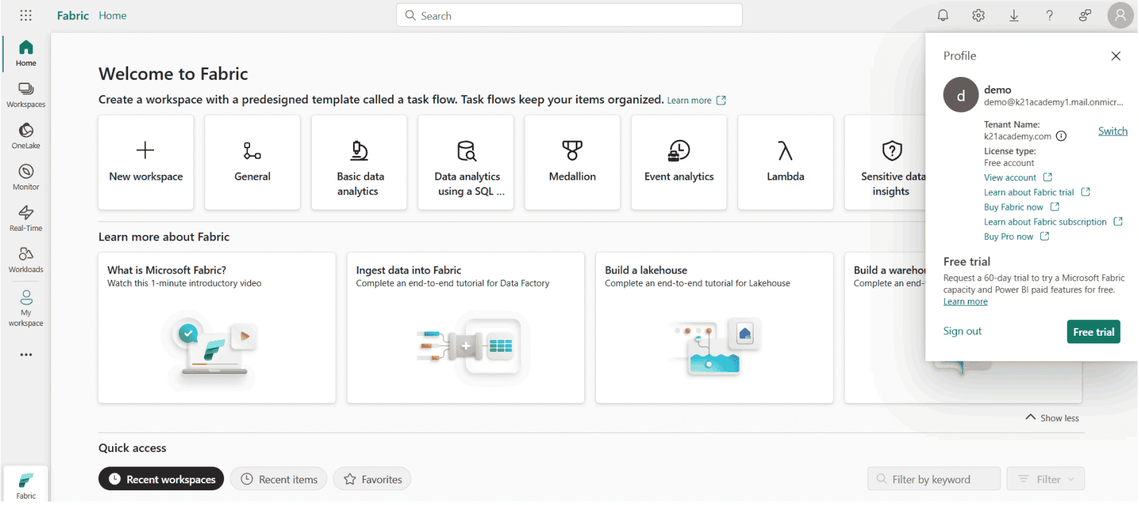 | Trial | Try Fabric features and experiences for 60 days. | Microsoft Fabric (Free) license | All Fabric experiences |