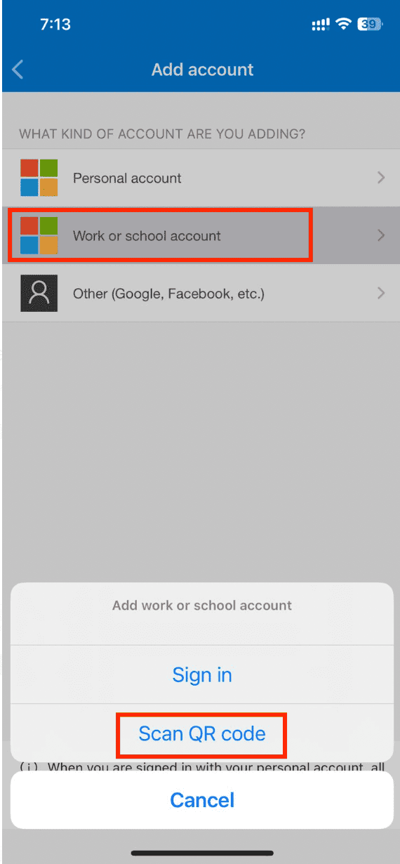 3. Select: Work or School Account & then use Scan QR Code