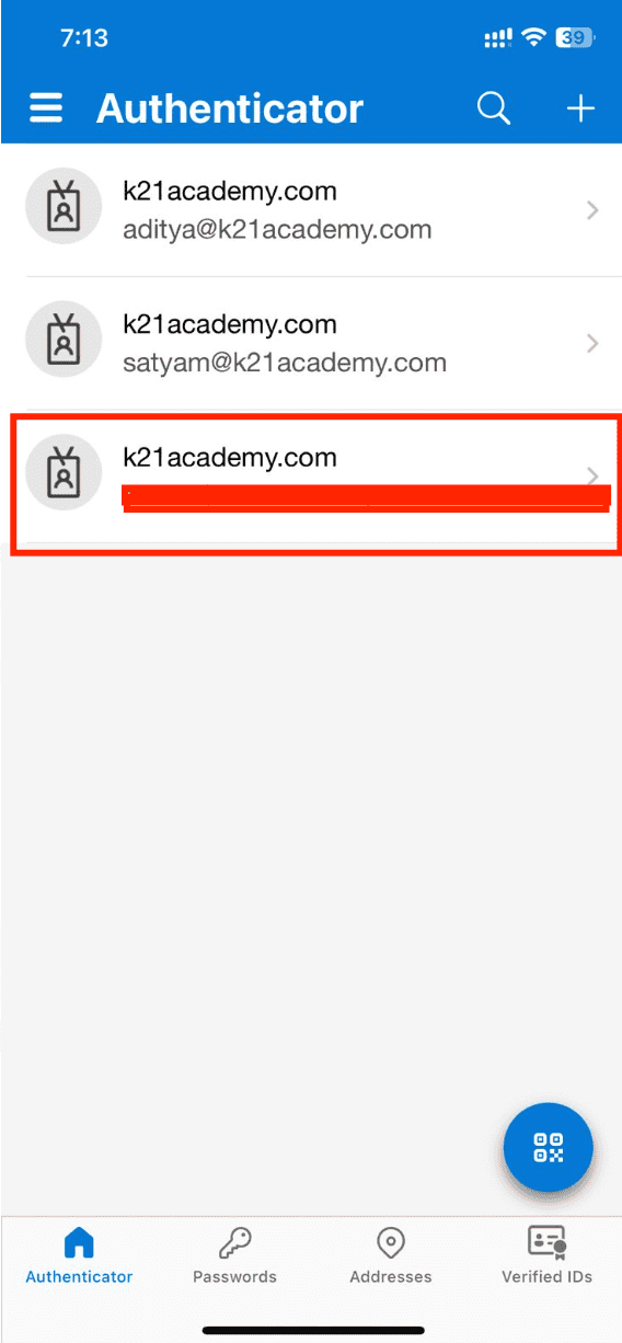 4. Scan QR code that’s on Chrome browser and you should see your user configured with Microsoft Authenticator App like below