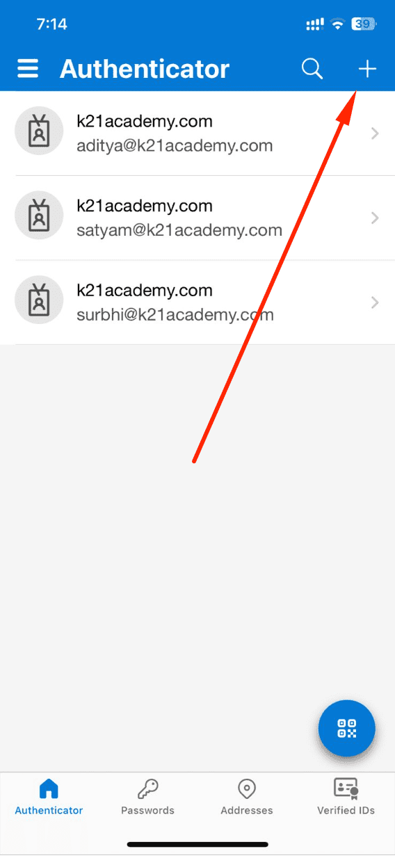 2. Open the Microsoft Authentication App on your phone and click on the + icon at the top right