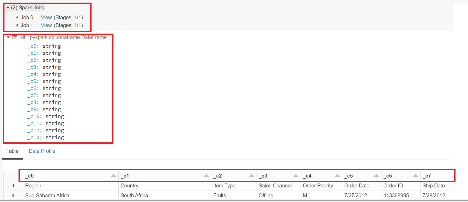 3. Run it by clicking on the Run Cell or CTRL + ENTER. The code was executed successfully and I see the cluster created 2 spark jobs to read and display the data from the ‘Country Sale’ data file. Also if you notice the schema is not exactly right, it shows String for all the columns, and the Header doesn’t seem right ( _c0,_c1..etc).