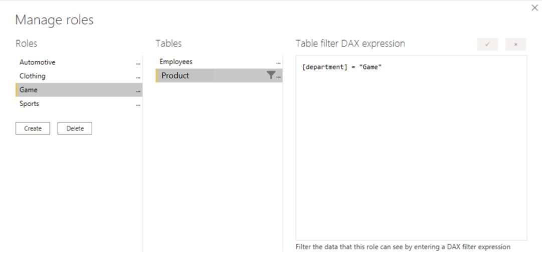 - On the Manage roles page, you can create a role for each department and then add a DAX expression to it.