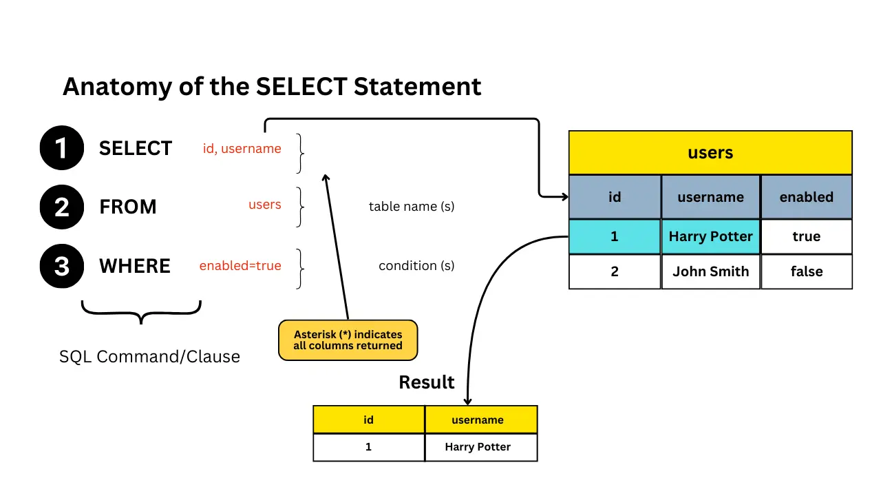 SELECT,INSERT,UPDATE, andDELETEfor interacting with data. - Data Control Language (DCL): Commands like