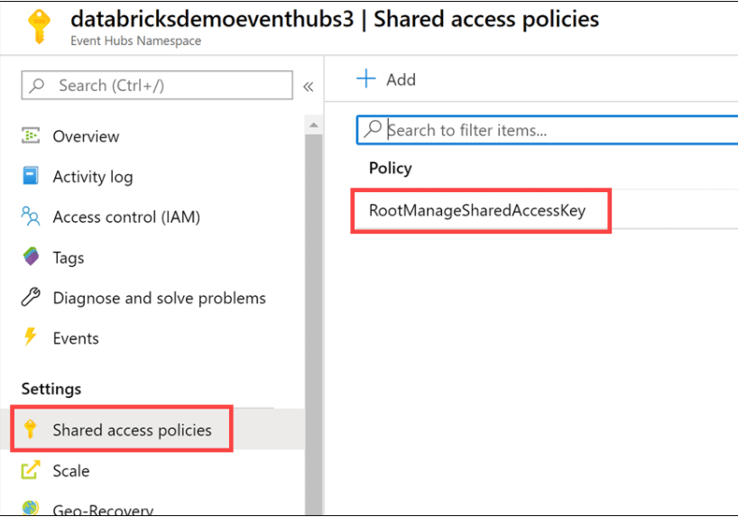 1) On the left-hand menu in your Event Hubs namespace, select Shared access policies under Settings, then select the RootManageSharedAccessKey policy.