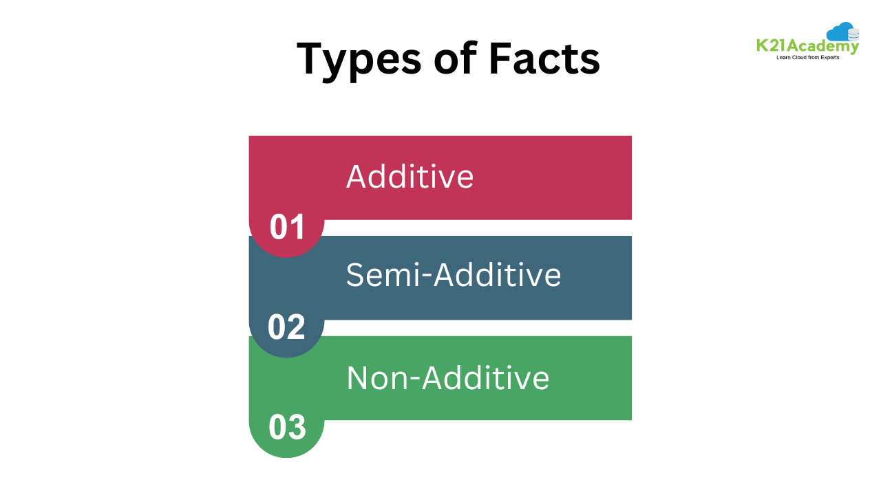 - Additive: These can be summed over any dimension connected with the fact table, making them the most valuable and flexible.