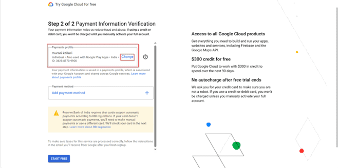 Step 5: Now enter the details as asked in Step 2 of 2[payment verification]. The payment profile will be selected automatically from your signed mail address, You can also change the payment profile, and click on change to enter the required details.