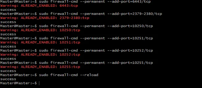$ sudo firewall-cmd --permanent --add-port=6443/tcp $ sudo firewall-cmd --permanent --add-port=2379-2380/tcp $ sudo firewall-cmd --permanent --add-port=10250/tcp $ sudo firewall-cmd --permanent --add-port=10251/tcp $ sudo firewall-cmd --permanent --add-port=10252/tcp $ sudo firewall-cmd --permanent --add-port=10255/tcp $ sudo firewall-cmd –reload