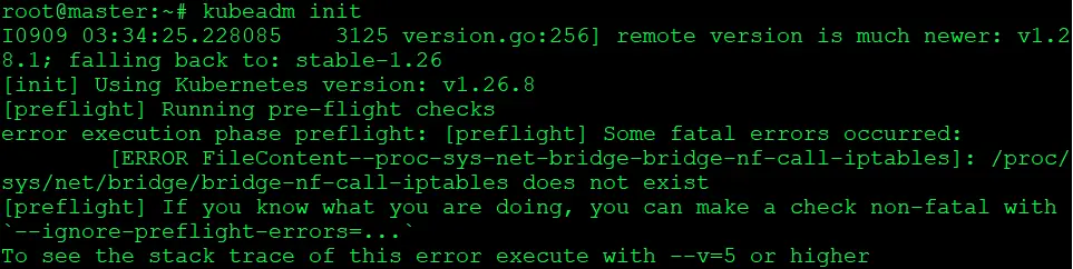 This error indicates that the specified kernel module or sysctl setting related to iptables is missing. Kubernetes relies on this setting to properly configure networking, and its absence can cause issues during initialization.