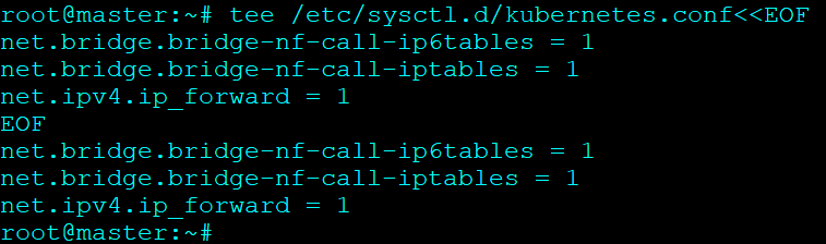 tee /etc/sysctl.d/kubernetes.conf<<EOF net.bridge.bridge-nf-call-ip6tables = 1 net.bridge.bridge-nf-call-iptables = 1 net.ipv4.ip_forward = 1 EOF