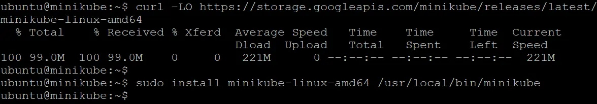 curl -LO https://storage.googleapis.com/minikube/releases/latest/minikube-linux-amd64 sudo install minikube-linux-amd64 /usr/local/bin/minikube