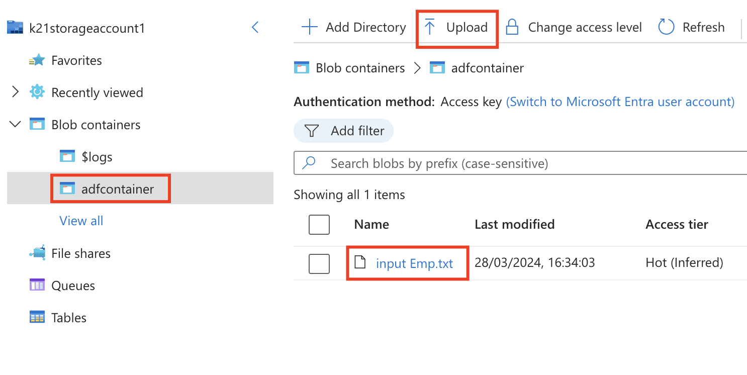3) Upload the emp.txt file to the adfcontainer folder.